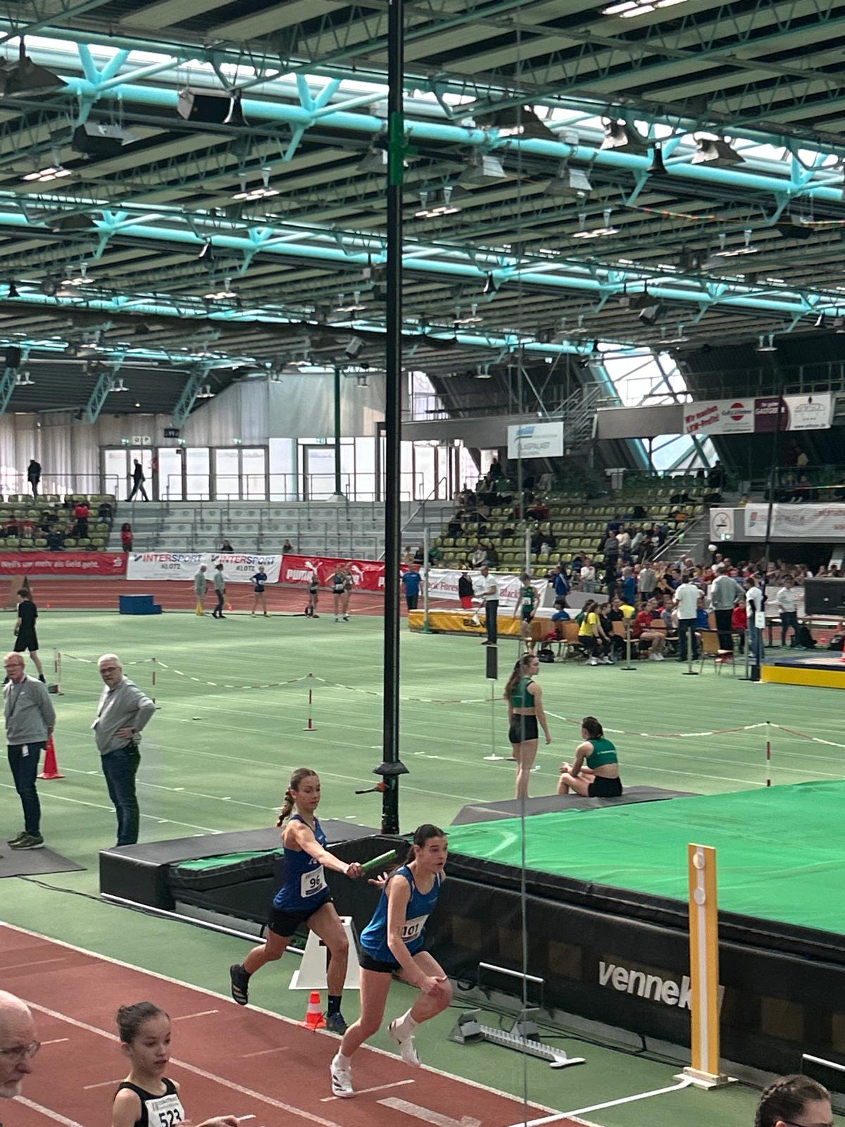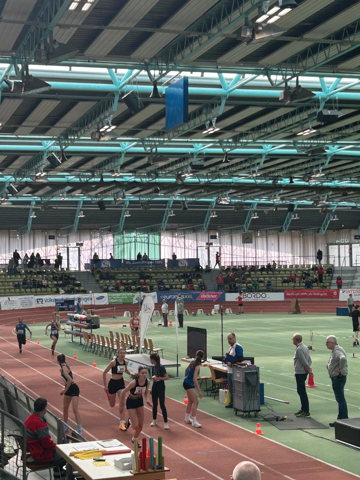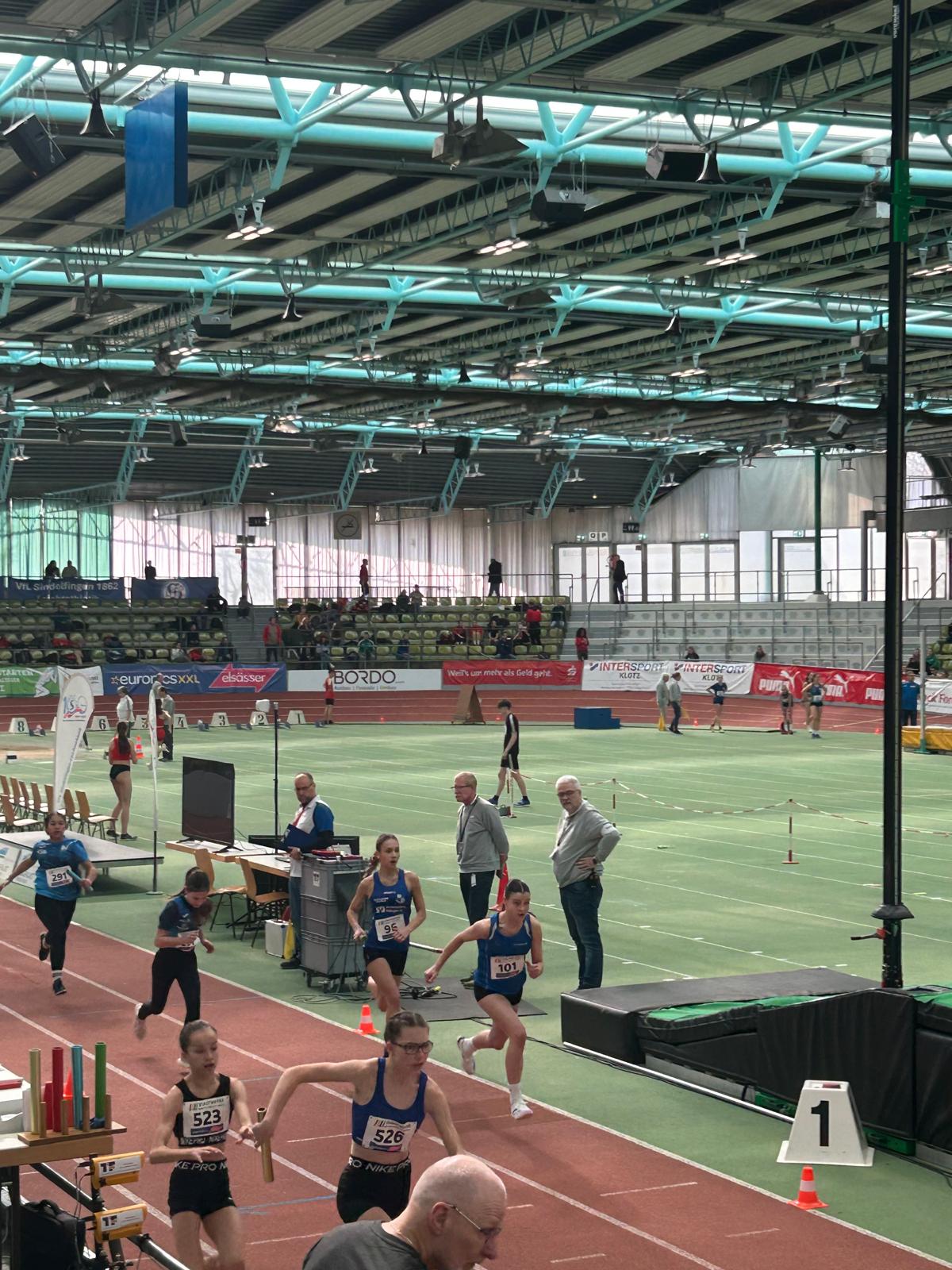 Die Staffel der wU16 lief im dritten von insgesamt sieben Vorläufen. Emma Baumann lief die Staffel stark an und übergab an Annabell Butz an zweiter Stelle. Sie konnte den Platz halten und übergab an Marie Sautter, die auf die führende Staffel Boden gut machen konnte. Als Schlussläuferin konnte Lana Binder den zweiten Platz in 57,25sec. sicher in Ziel bringen. Dies bedeutete in der Endabrechnung den guten 14. Platz unter 21 Staffel. Ein toller Erfolg für die vier Mädchen, zumal es für alle das erste Rennen unter dem Hallendach und über 100m war und sie alle vier noch dem jüngeren Jahrgang angehören.