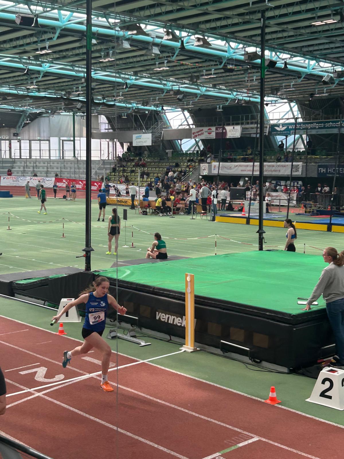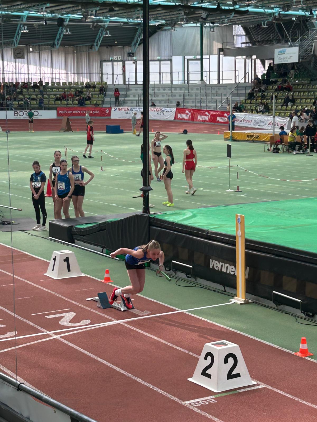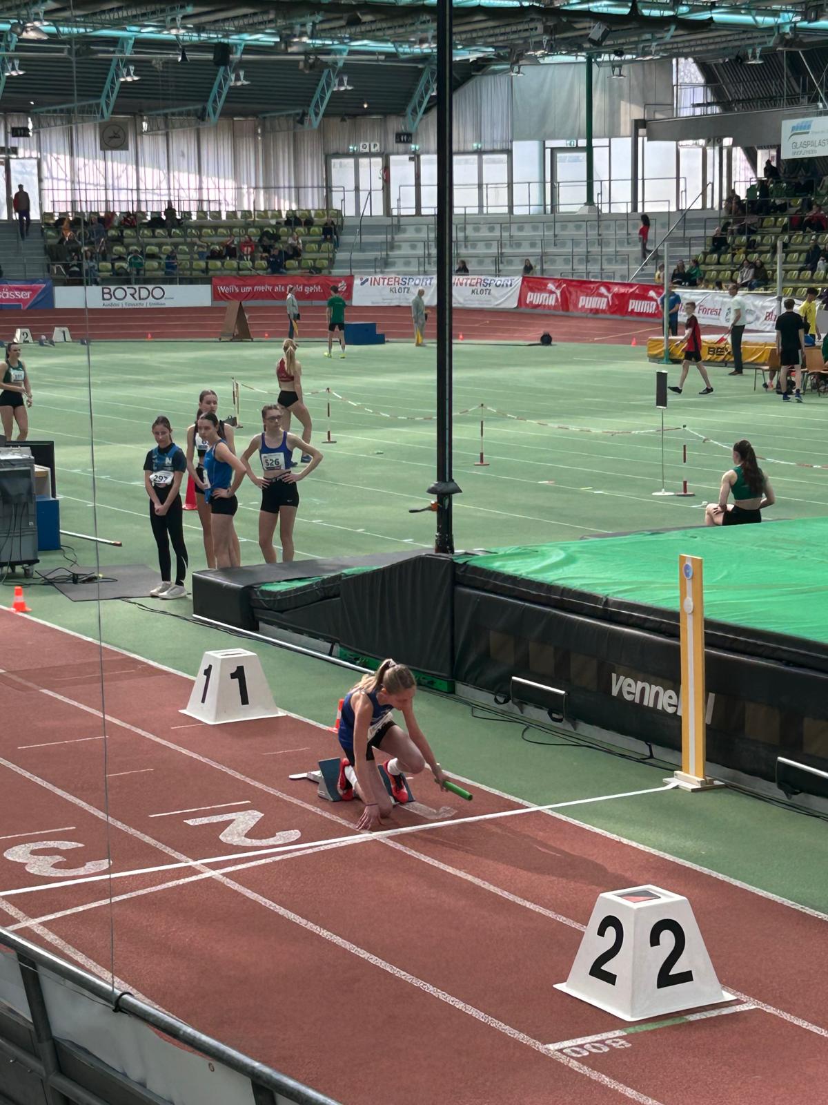 Die Staffel der wU16 lief im dritten von insgesamt sieben Vorläufen. Emma Baumann lief die Staffel stark an und übergab an Annabell Butz an zweiter Stelle. Sie konnte den Platz halten und übergab an Marie Sautter, die auf die führende Staffel Boden gut machen konnte. Als Schlussläuferin konnte Lana Binder den zweiten Platz in 57,25sec. sicher in Ziel bringen. Dies bedeutete in der Endabrechnung den guten 14. Platz unter 21 Staffel. Ein toller Erfolg für die vier Mädchen, zumal es für alle das erste Rennen unter dem Hallendach und über 100m war und sie alle vier noch dem jüngeren Jahrgang angehören.
