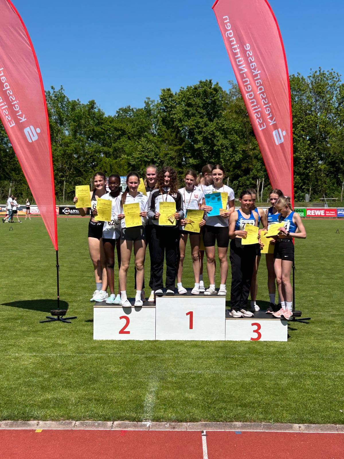 Auch die U16w14 trafen auf ein starkes Feld. Unter 17 Sprinterinnen wurde Lana Binder in neuer Bestzeit von 14,37m sechste, Emma Baumann in 15,15sec. 14. Im Hochsprung zeigten sich Marie Sautter und Annabell im Vergleich zur Vorwoche verbessert. Mit 1,46m kam Marie nahe an ihre Bestleistung und auf Platz vier; auch Annabell kam mit 1,40m nahe an ihre Besthöhe, was ihr den sechsten Platz einbrachte. Im Weitsprung lief leider nicht viel zusammen und so musste sich Lana mit 3,81m und Platz 15 und Emma mit 3,56m und Platz 16 zufrieden geben. Ganz anders sah es im Kugelstoßen aus. Marie bestätigte ihre gute Form und stieß sich mit 10,23m auf den dritten Platz. Lana kam sogar mit neuer Bestweite von 8,93m auf den vierten Platz und übertraf die Norm für die württembergischen Meisterschaften. Auch Annabell überzeugte mit 7,77m und Platz acht. In der Staffel über 4x100m liefen Emma, Annabell, Marie und Lana in guten 55,19sec. auf den dritten Platz (vgl. auch lokale Presse, Ergebnisse 2025).