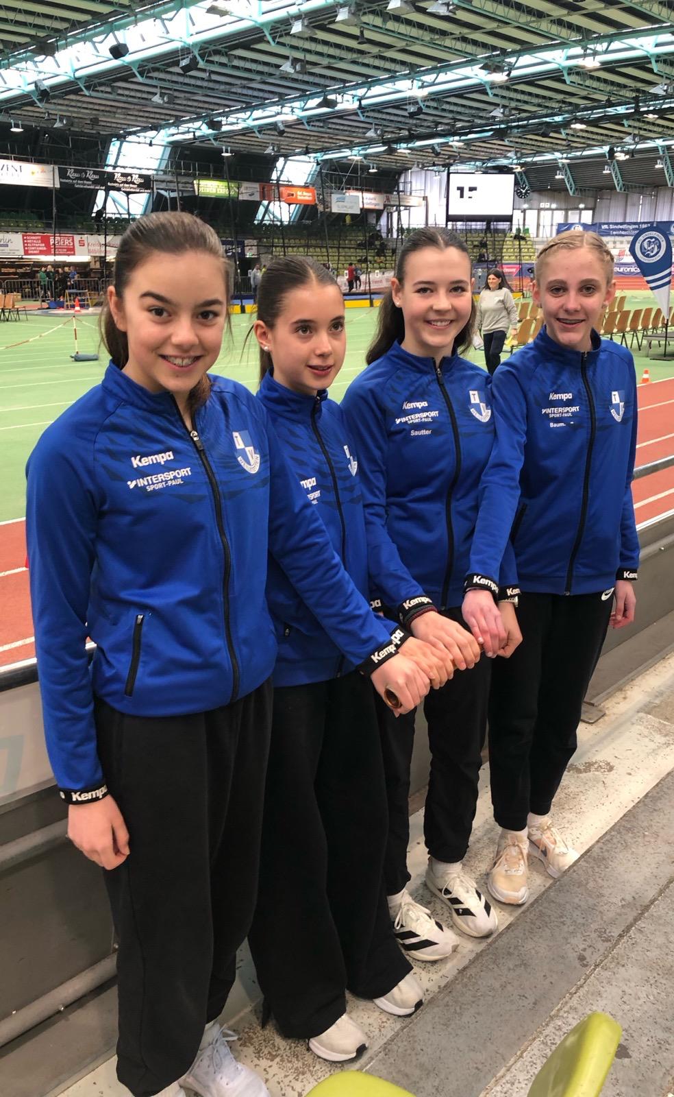 Bei den wU16 gab es fünf Vorläufe mit 18 Mannschaften. Unsere Staffel lief im fünften und damit letzten Vorlauf. Emma Baumann lief an und übergab an Lilly Sophie Sauter. Als drittes lief Mara Alber und als letzte Marie Sautter. Sie machten ihre Sache gut und kamen in 55,84sec. ins Ziel. In ihrem Lauf wurde eine Staffel disqualifiziert und eine gab auf. Äußerst knapp verpasste sie den B-Endlauf als insgesamt neunte Staffel. Trotzdem ein schöner Erfolg.