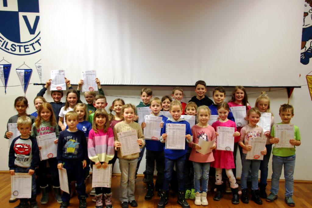 2024 haben 64 (74) das Mehrkampfabzeichen erfolgreich beim TV Weilstetten abgelegt, einige wieder mit Zahl. Dabei erfüllten 6 Aktive und Jugendliche die Kriterien, davon 45 in Gold, 11 in Silber, 8 in Bronze. Dazu kommen noch 59 (65) Mehrkampfabzeichen im Schülerbereich.