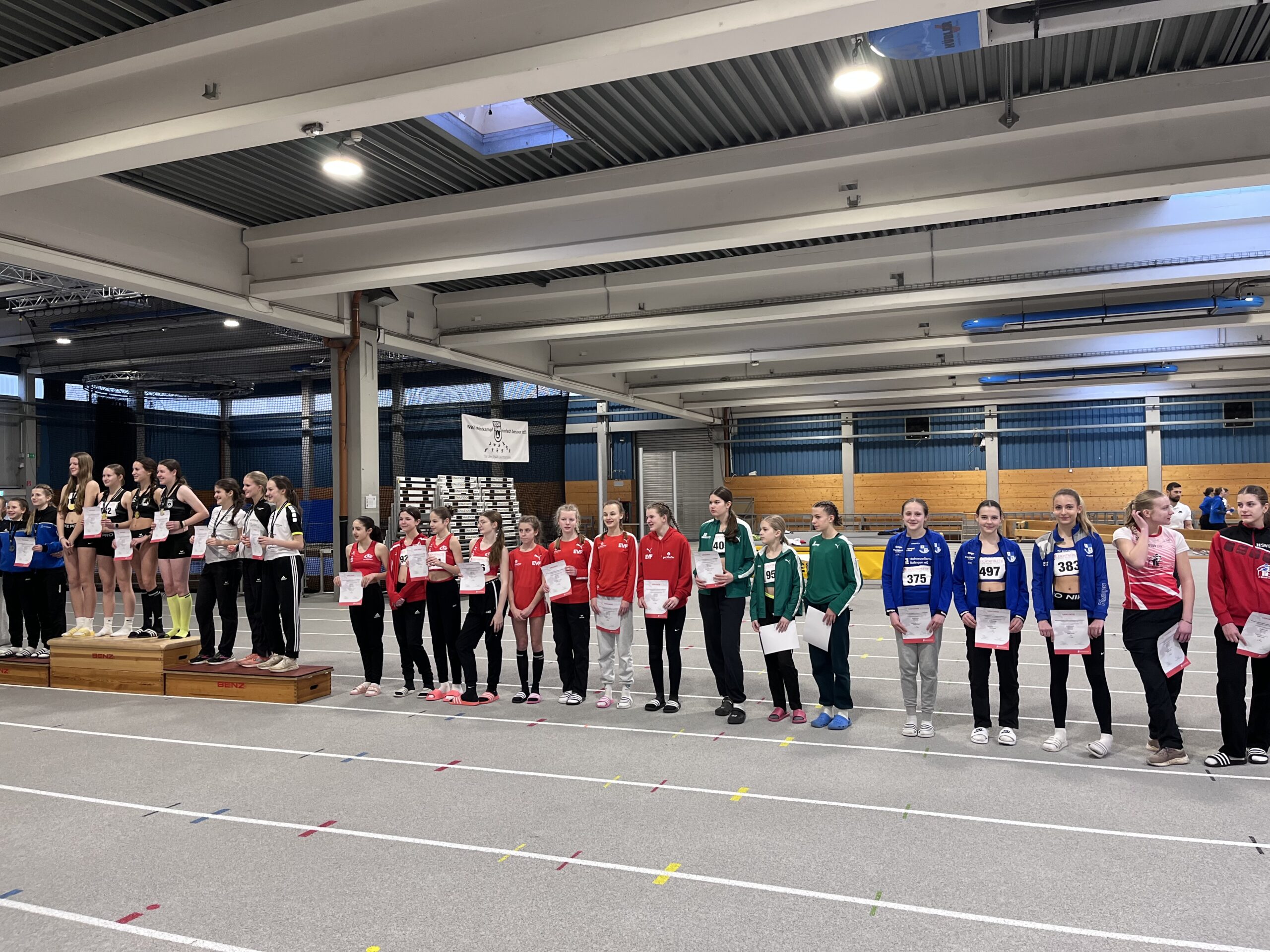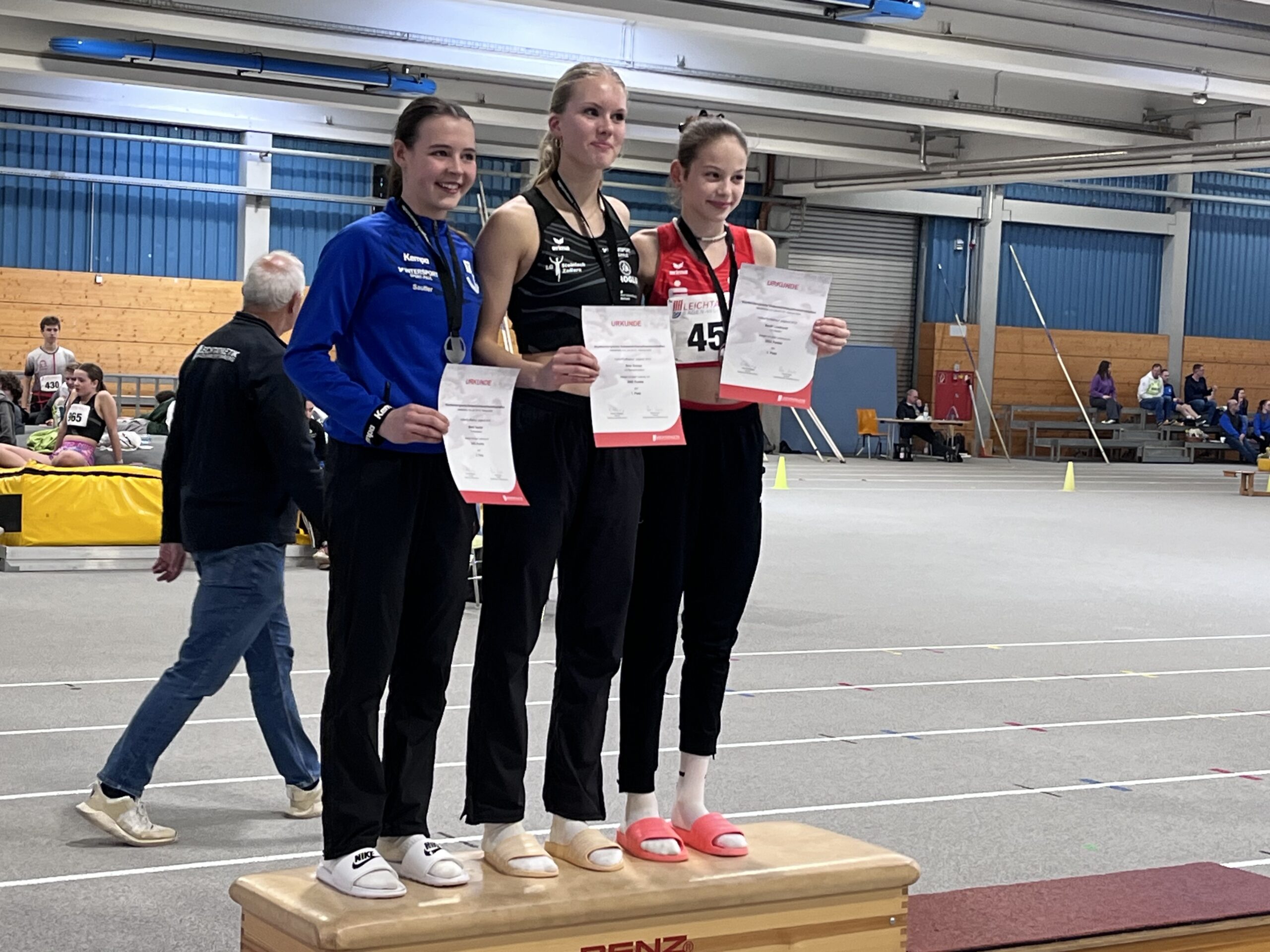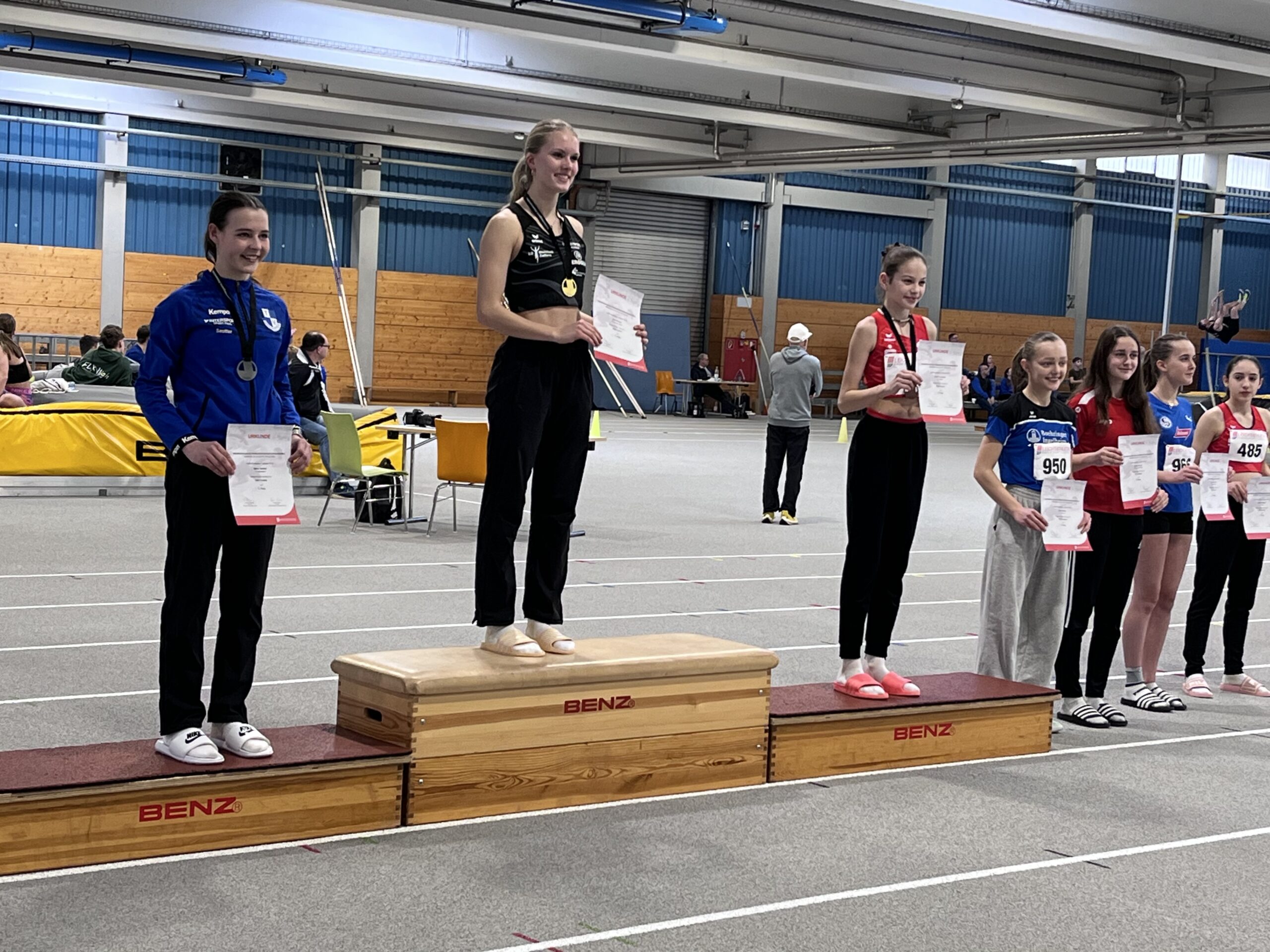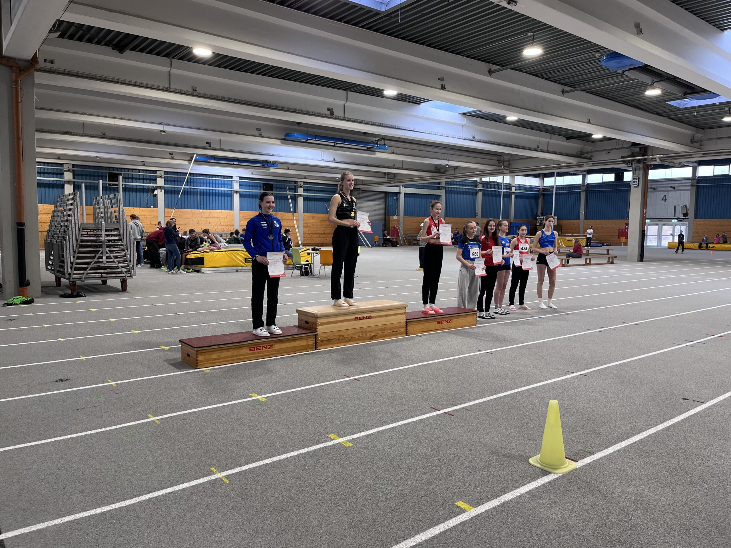 Am frühe Sonntagmorgen ging es für Marie Sautter, Annabell Butz und Lana Binder (alle U16w14) in ihrem ersten Mehrkampf unter dem Hallendach mit dem Kugelstoßen los. Gleich in ihrem erste Stoß verbesserte Marie ihre Bestleistung deutlich auf 10,07m und konnte sich im weiteren Verlauf noch weiter deutlich auf 10,30m und im letzten Durchgang sogar auf 10,66m steigern. Damit verließ sie den Kugelstoßring als zweitbeste Stoßerin im Feld. Auch Annabell und Lana machten ihre Sache sehr gut. Lana steigerte sich kontinuierlich im Wettbewerb und verbesserte im letzten Stoß mit 8,07m ihre Bestleistung. Somit war sie die fünftbeste im Feld gefolgt von Annabell. Auch sie verbesserte sich von Durchgang zu Durchgang und erzielte mit 7,97m eine neue Bestleistung. Mit dieser gutem Start ging es für die drei zum Hürdenlauf. Mit einem blitzsauberen Lauf sicherte sich Marie den Disziplinsieg mit neuer Bestzeit von 9,58sec. und schob sich im Zwischenklassement auf den ersten Platz nach vorne. Auch Lana lief als 10. in 11,02sec. und Annabell in 11,09sec. Bestzeit und unterstrichen den guten Start in den Hallenfünfkampf. Im anschließenden Hochsprung konnte Lana leider nicht die Einstiegshöhe überwinden. Dagegen konnten Marie und Annabell ihre Bestleistung aus dem Vorjahr mit 1,48m bzw. 1,40m einstellen. Marie war so die beste Springerin im Feld, Annabell die sechstbeste. Damit konnte Marie ihren Führung behaupten. Der Weitsprung stellte für die drei den ersten Wettkampf mit Brett und ohne Zone dar. Dazu hatten sie nicht viele Anlaufkontrolle im Training. Lana konnte nach einem guten ersten Satz mit 4,02m nicht nachlegen und musste sich damit zufrieden geben. Annabell traf das Brett gut, sprang aber nicht und so gab es nur dürftige 2,26m. Marie hatte einen ersten guten Versuch mit 4,38m und riskierte so in den folgenden Versuchen, übertrat die deutlich weiteren Sätze aber. Vor dem abschließenden 800m lag sie so an zweiter Stelle, Annabell und Lana im hinteren Mittelfeld. Im Lauf mobilisierten alle drei nochmals alle Kräfte, Annabell lief 3:11,66, Lana 2:59,62 und Marie 2:57,49. Damit feierte Marie ihren größten Erfolg in ihrer noch jungen Kariere und gewann mit sehr guten 2.463 Punkten die Silbermedaille. Annabell wurde mit 1.843 Punkten 13. und Lana mit 1.693 Punkten 16. unter 20. Mehrkämpferinnen. In der Mannschaftswertung belegten sie mit 5.999 Punkten den siebten Rang.
