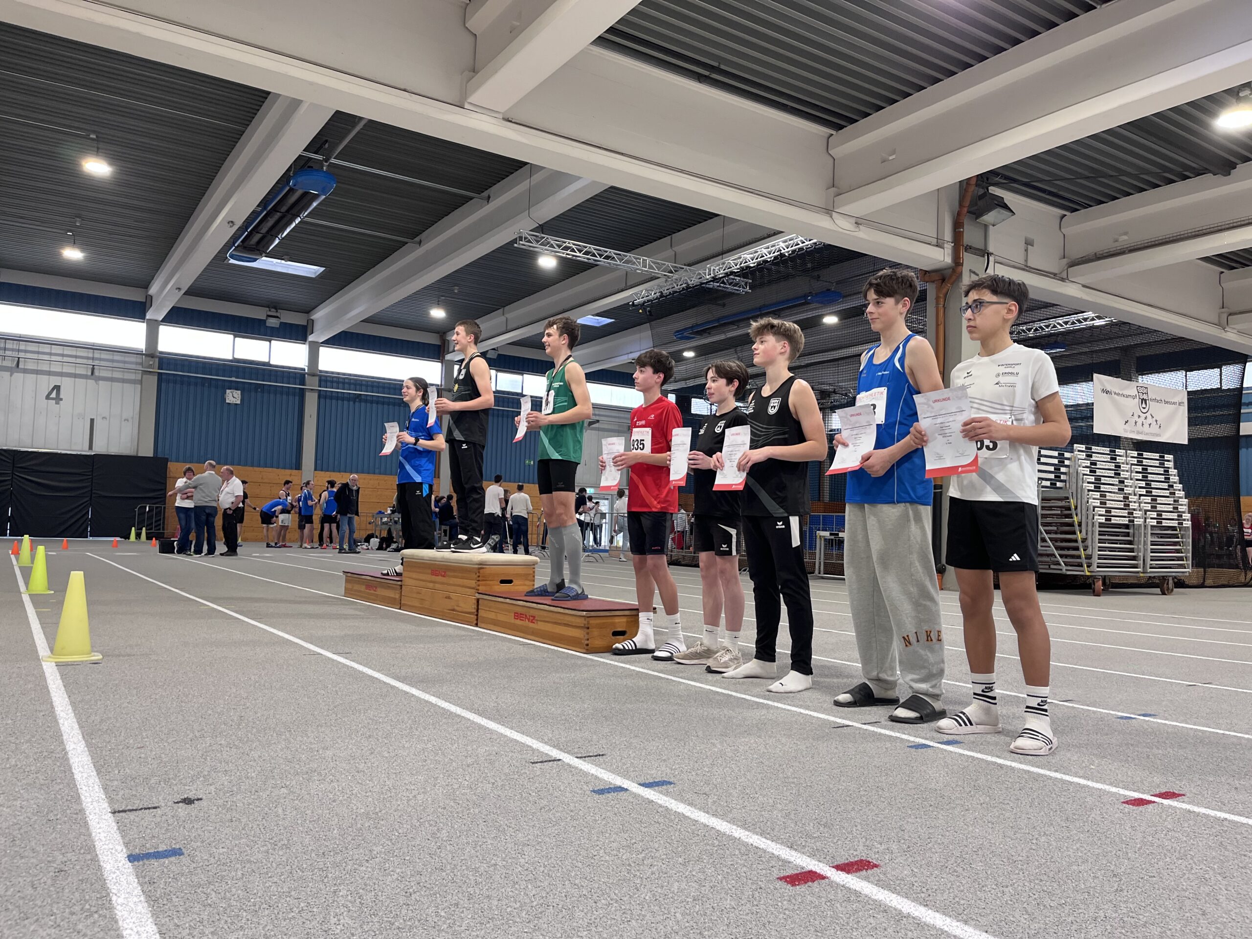 Für Simon Helber (U16m14) ging es am frühen Samstagmorgen mit Weitsprung los. Sein erster Wettbewerb mit Brett und ohne Zone verlief unrund. Nach 4,14m steigerte er sich auf 4,26m und übertrat leider den letzten Versuch und fand sich auf dem 16. Platz wieder. Im Kugel konnte er nicht an die Anfang Februar gezeigten Leistungen anknüpfen und musste sich mit 7,86m zufrieden geben. Trotzdem schob er sich auf den elften Zwischenrang nach vorne. Im Hochsprung zeigte er sich dann hellwach. Nachdem er über 1,44m den zweiten Versuch benötigte, stellte er mit 1,48m gleich im ersten Versuch eine neue Bestleistung auf und steigerte diese sogar mit einem gelungenen dritten Versuch über 1,52m. Als viertbester Hochspringer im Feld schob er sich vor dem abschließenden 1.000m-Lauf auf den achten Platz nach vorne. In einem beherzten Rennen gingen ihm auf den letzten Runden etwas die Kräfte aus, kam aber in guten 3:2,82 als viertbester ins Ziel. Mit dieser Leistung verbesserte er sich weiter und schloss seinen ersten Hallenfünfkampf mit 2.209 Punkten auf den guten siebten Rang ab.