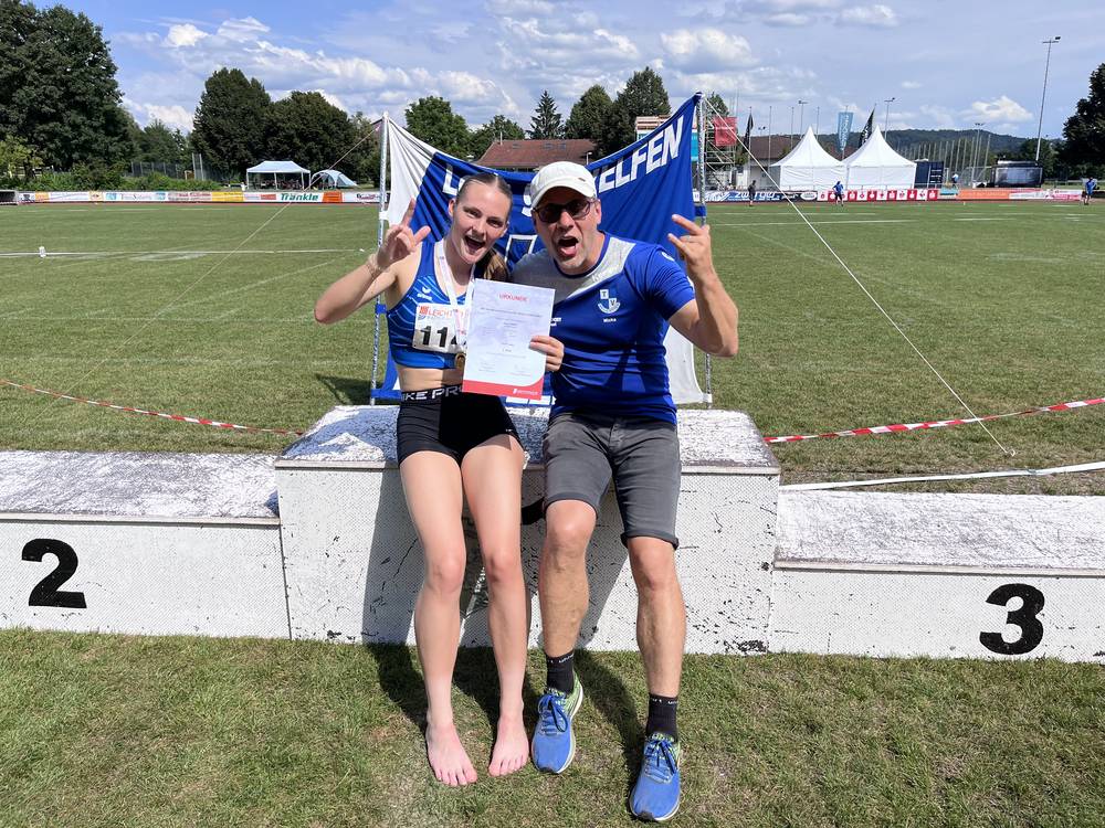 Tag zwei begangg mit dem Weitsprung. Das Einspringen ließ einiges erwarten und so setzte sie den ersten Versuch gleich auf eine neue Saisonbestweite von 5,27m. Im zweiten Sprung konnte sie mit 5,15m nochmals einen guten Versuch zeigen und riskierte im letzten Versuch alles. Leider war der tolle Satz ungültig. Dennoch war sie die beste Springerin im Feld und baute ihren Vorsprung weiter aus. Im Speerwurf setzte sie den ersten Wurf knapp unter die 39m-Marke und konnte sich im zweiten Versuch nicht steigern. Im letzten Versuch sammelte sie nochmals alle Kräfte und es passte fast alles. Mit 41,50m erzielte sie eine neue Bestweite und ging mit einem Polster von über 300 Punkten in den abschließenden 800m-Lauf. Diesen Lauf konnte sie befreit bestreiten. Von Anfang lief sie couragiert und sehr flott an. In den zweiten Runde konnte sie auf den letzten Metern nicht mehr ganz das Tempo halten, schloss diesen aber mit neuer persönlichen Bestleistung von 2:32,07 ab. Mit diesem tollen Abschluss sicherte sie sich souverän den Siebenkampftitel mit 400 Punkten Vorsprung. Mit sehr guten 5.133 Punkten verbesserte sie ihren eigenen Vereins- und Kreisrekord erneut und schob sich auf die dritte Position der aktuellen Deutschen Bestenliste. Ein toller Erfolg für die junge Mehrkaämpferin (vgl. auch lokale Presse, Ergebnisse 2024).