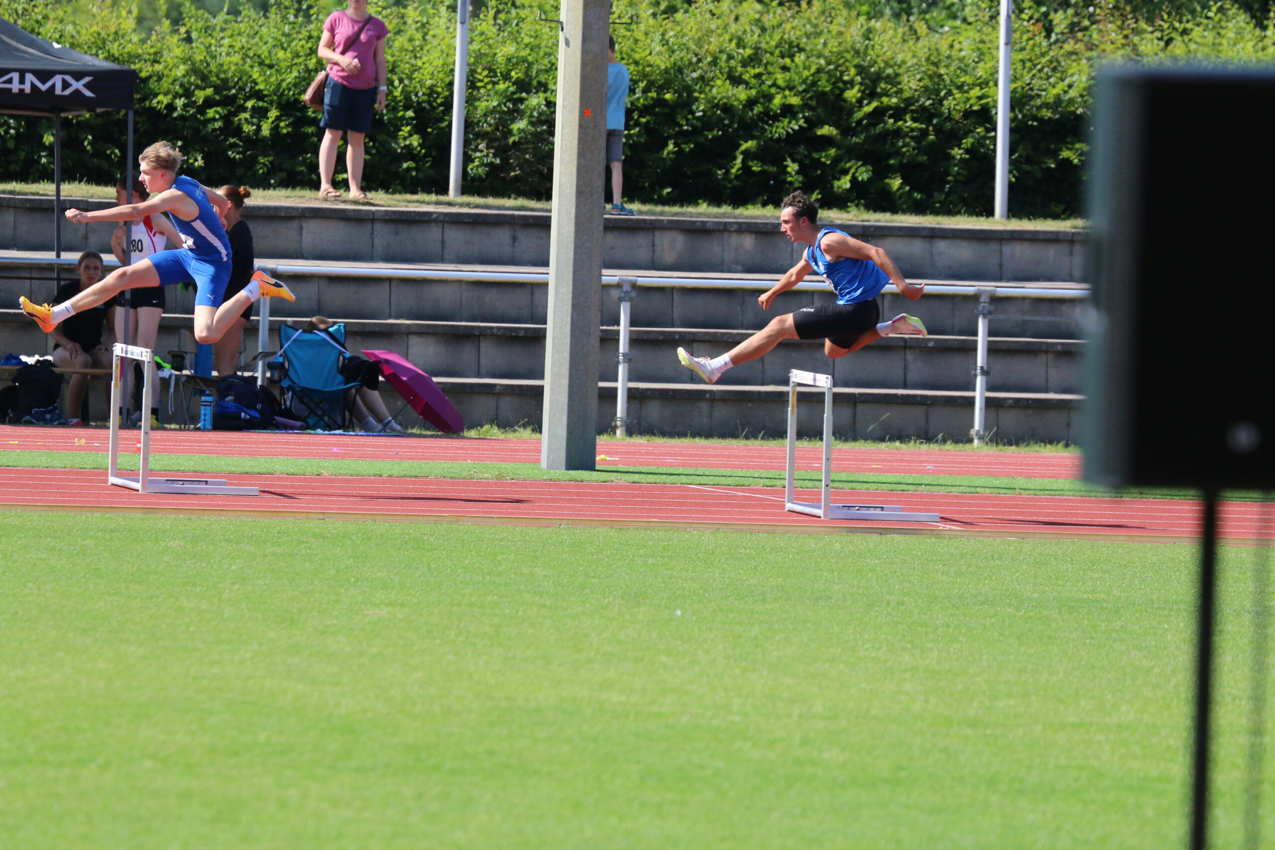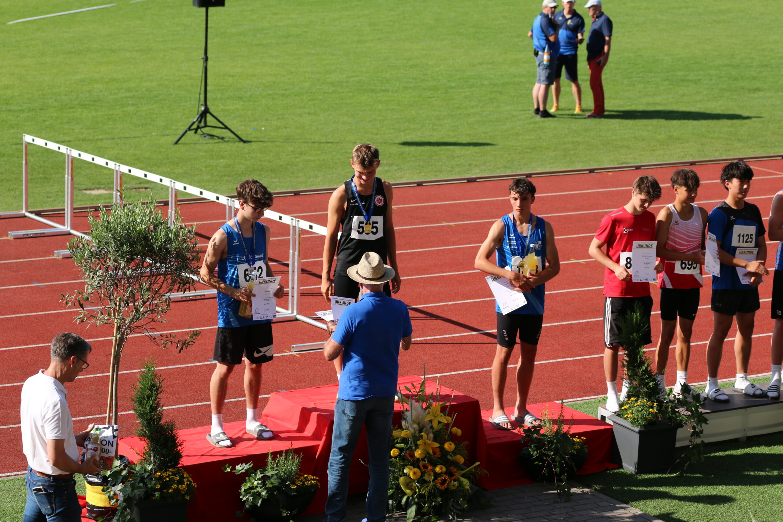 Für Colin Hoch ging es auch zunächst über die 80m Hürden. 26 Läufer gingen in vier Vorläufen an den Start. Colin lief im zweiten Vorlauf. Leider erwischte er keinen guten Start und fand auch nicht in den Lauf und kam als fünfter in für ihn mäßigen 12,00sec. ins Ziel. Als 17. des Feldes verpasste er den Finallauf deutlich. Am späten Nachmittag stand dann noch für ihn die 300m Hürden an, bei denen 17 Läufer in drei Zeitläufen den Meister ermittelten. Er lief im zweiten Zeitlauf und zeigte eine tolle Trotzreaktion zu seinen Kurzhürden am Vormittag. Von Anfang an zeigte er sich hellwach, arbeitete sich auf den letzten 100m stetig nach vorne und sicherte sich im Finish den Sieg mit 42,64sec. Somit konnte er seine Bestleistung um mehr als eine halbe Sekunde verbessern und die Bronzemedaille in der Gesamtwertung erringen, ein toller Erfolg für den jungen Läufer. Auf den 100m-Lauf am Sonntag hatte er bereits im Vorfeld verzichtet.