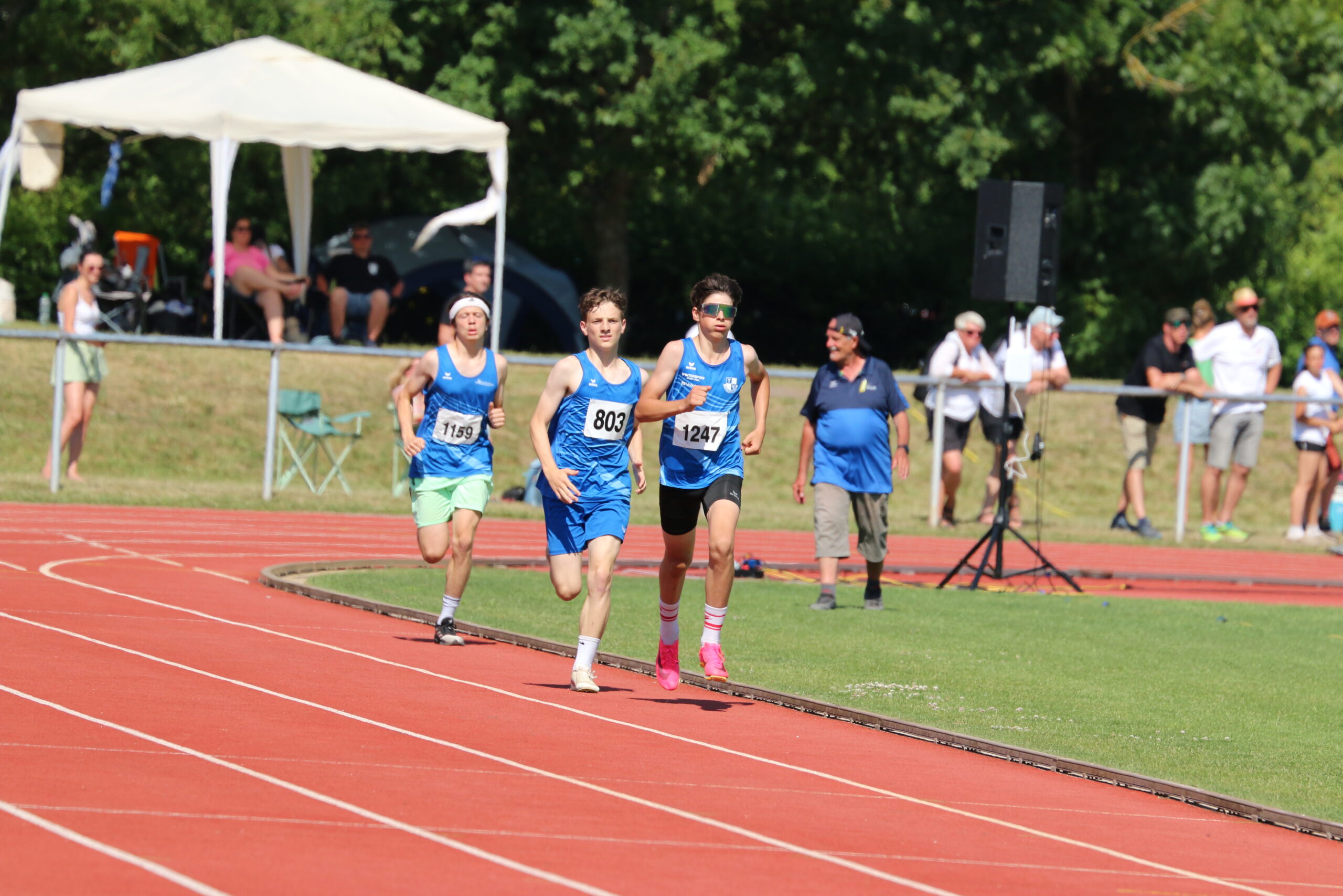 Über 800m gab es bei den M14 für insgesamt 15 Läufer zwei Zeitläufe. Simon Helber ging im ersten Zeitlauf an den Start. In der ersten Runde konnte er noch etwas mit dem Tempo mithalten, doch in der zweiten Runde zollte er der Hitze Tribut, musste etwas abreißen lassen und kam als sechster in 2:24,65 ins Ziel. So konnte er nicht ganz an seine Vorleistungen anknüpfen. Mit dem insgesamt 14. Platz trotzdem ein Erfolg für ihn bei seinen ersten süddeutschen Meisterschaften.